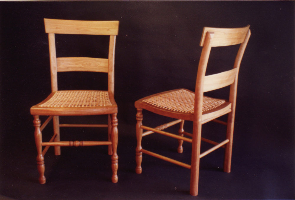 This chair was designed with a family heirloom chair in mind. It uses round mortise, tenons & pre-shrunk spindles for tight joints. The seat is woven of natural leather. The crest rail is from a single board sawed & glued twice to form a curve.