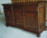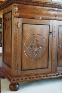 This butternut cabinet in Mexican style was built to hold a powerful stereo system. It has contoured drawers with mountains carved across the fronts, carved moldings, ebonized beading and break front set back. All surfaces were hand worked with plane and chisel before finishing.