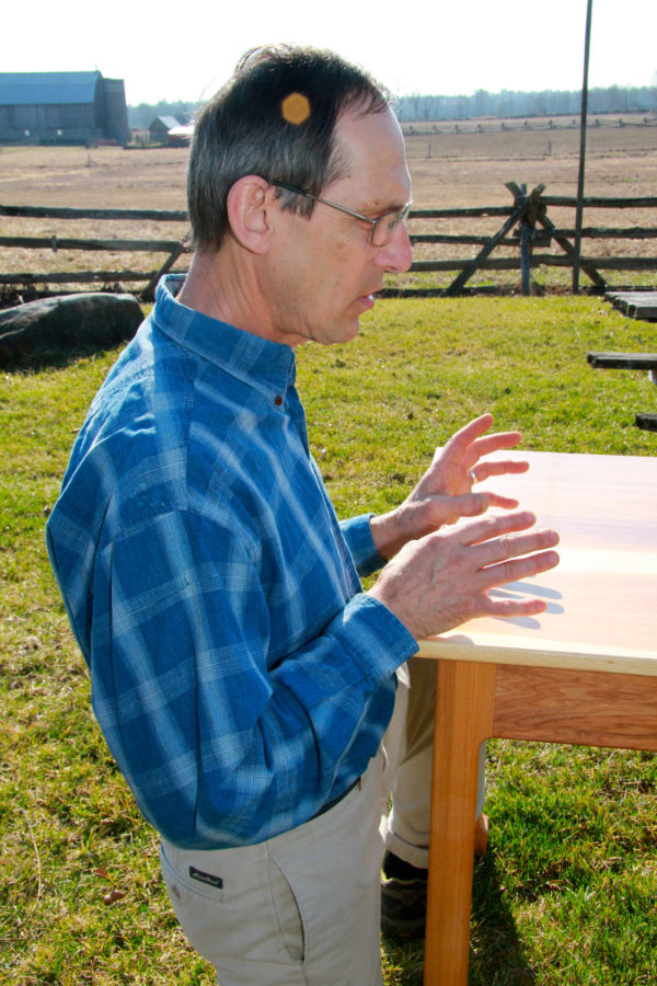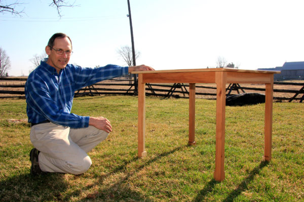 This table is part of a suite for a health centre. Hickory was chosen for its extreme hardness and beautiful colour. The detailing recalls asian roots of its owner with incurved legs but with a spare modern style. The wood has strong open grain and white sapwood that will slowly darken with age.