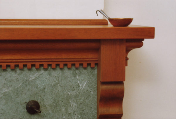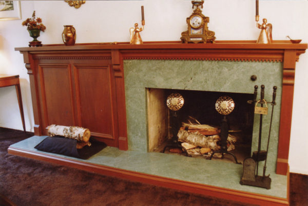 This Honduras Mahogany fireplace was built to replace a painted two-by-four. It includes paneled offset ogee brackets and beaded cornice mouldings, and bold dentils (see detail). The hearth and surround are of fine Italian verdigris marble.